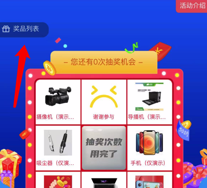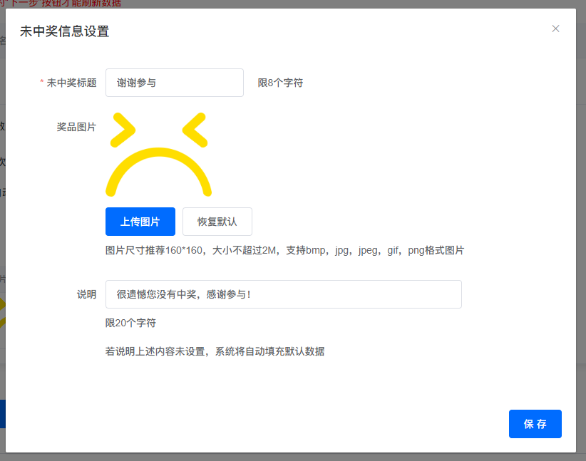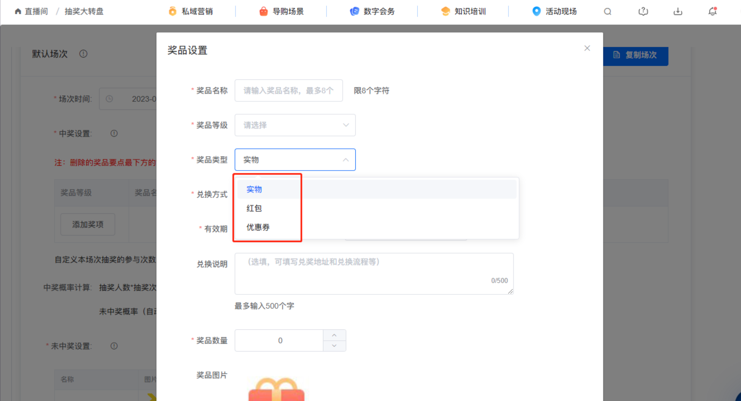 点击【添加奖项】,填写奖品信息并保存(实物奖品、红包、优惠券三种)