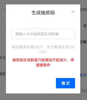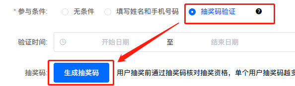 (4)抽奖码:当参与条件为【抽奖验证码】时,需要生成抽奖码,抽奖码单次最多生成500个,合计最多生成10000个