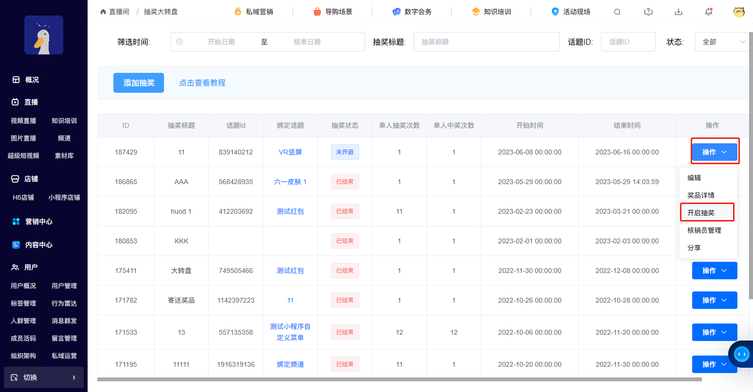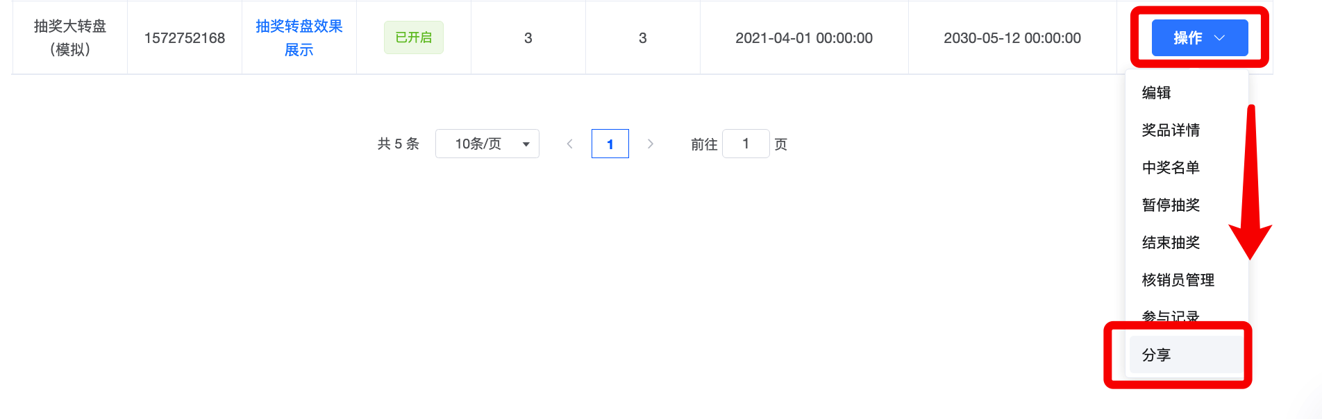 回到抽奖大转盘管理页,点击【操作】-【开启抽奖】开启抽奖模式