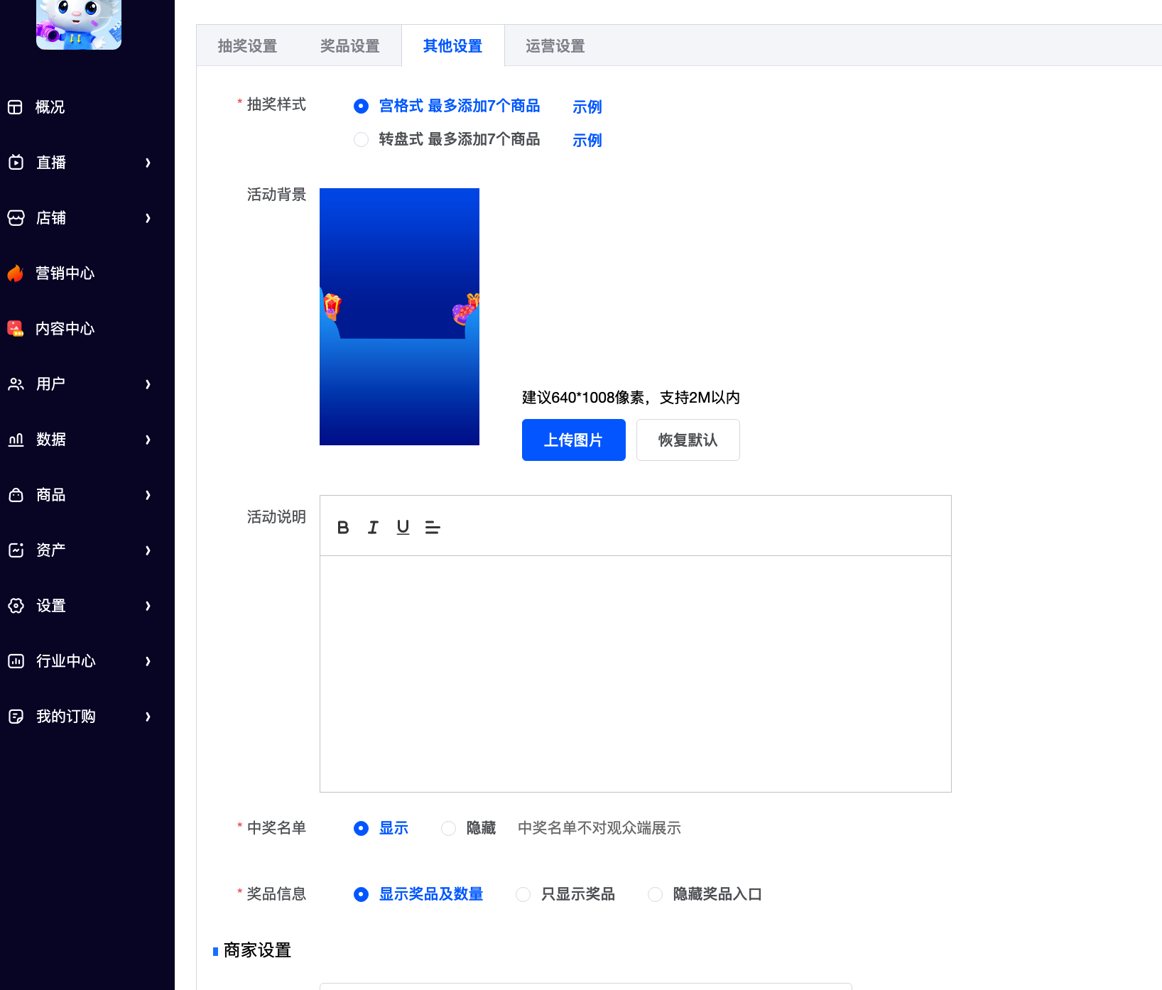 其他设置可选择抽奖样式、填写活动背景、活动说明、中奖设置和分享设置等