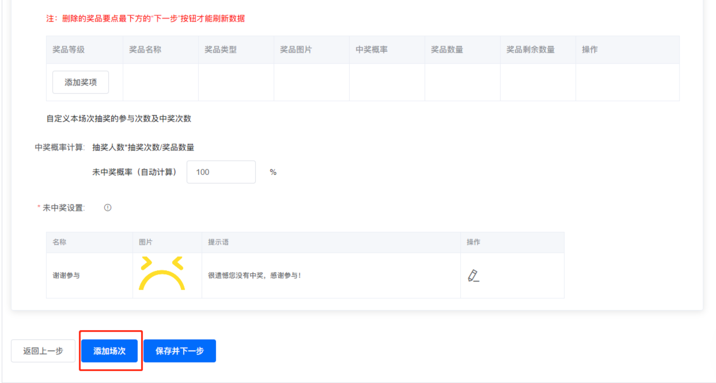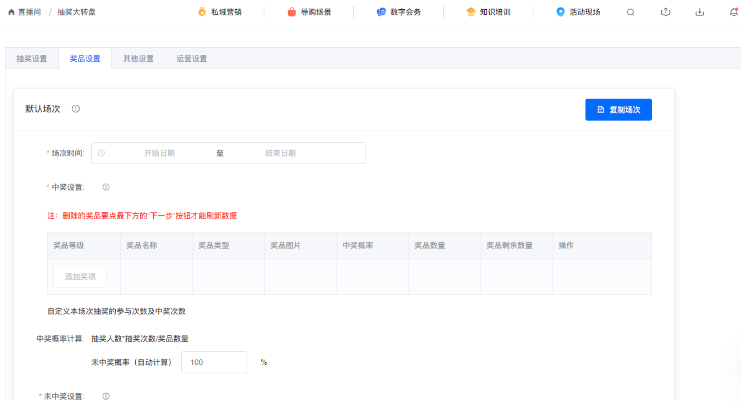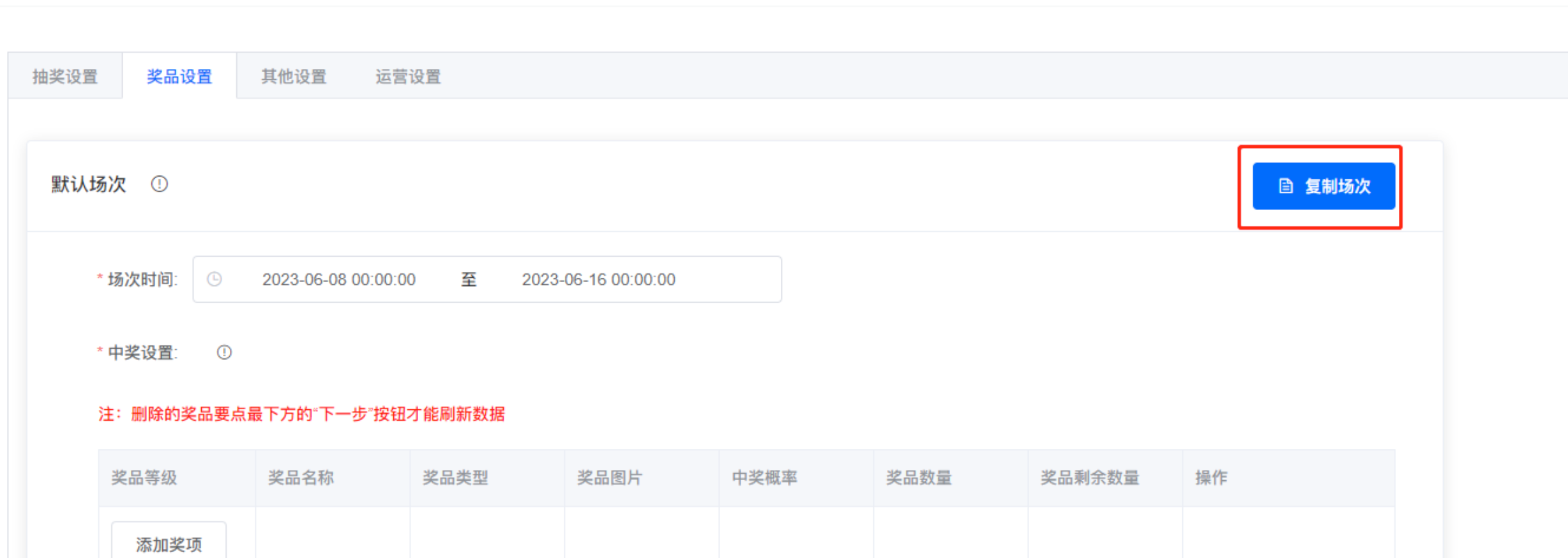 奖项都设置完成后,可点击【添加场次】或者【复制场次】添加多场抽奖活动