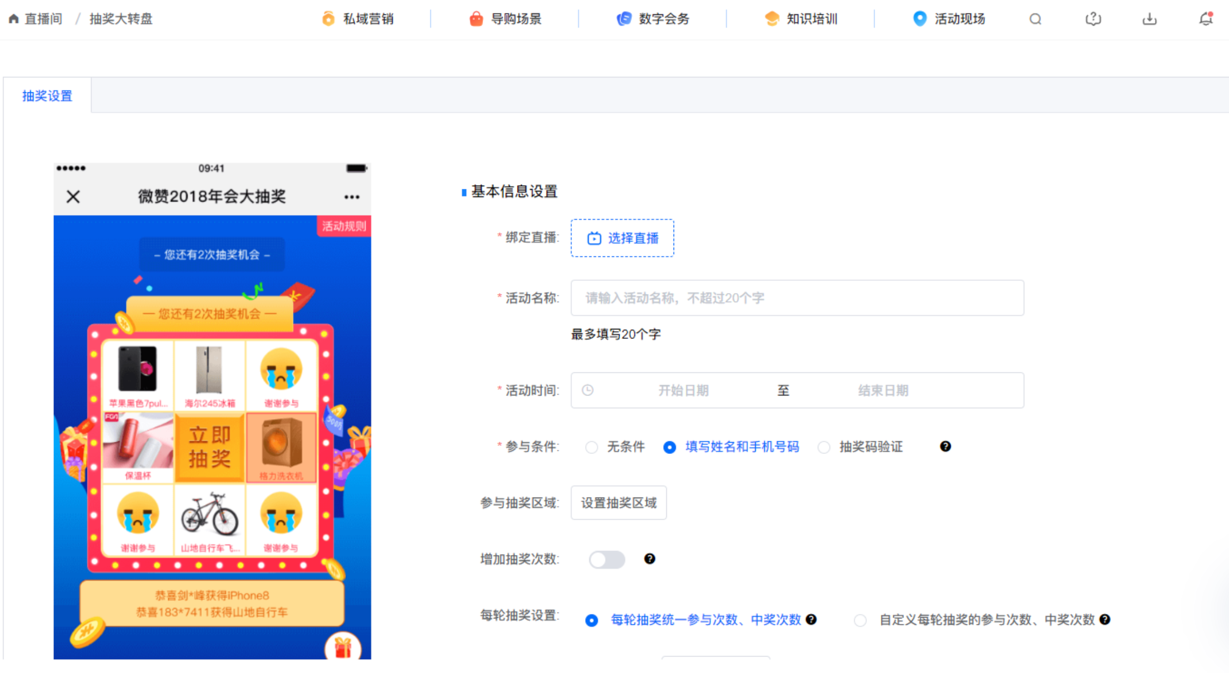 抽奖设置需绑定话题(绑定的话题可以是竖屏直播、家居直播等)、活动名称、活动时间、参与条件、抽奖区域设置、参与次数、增加抽奖人数、中奖次数等
