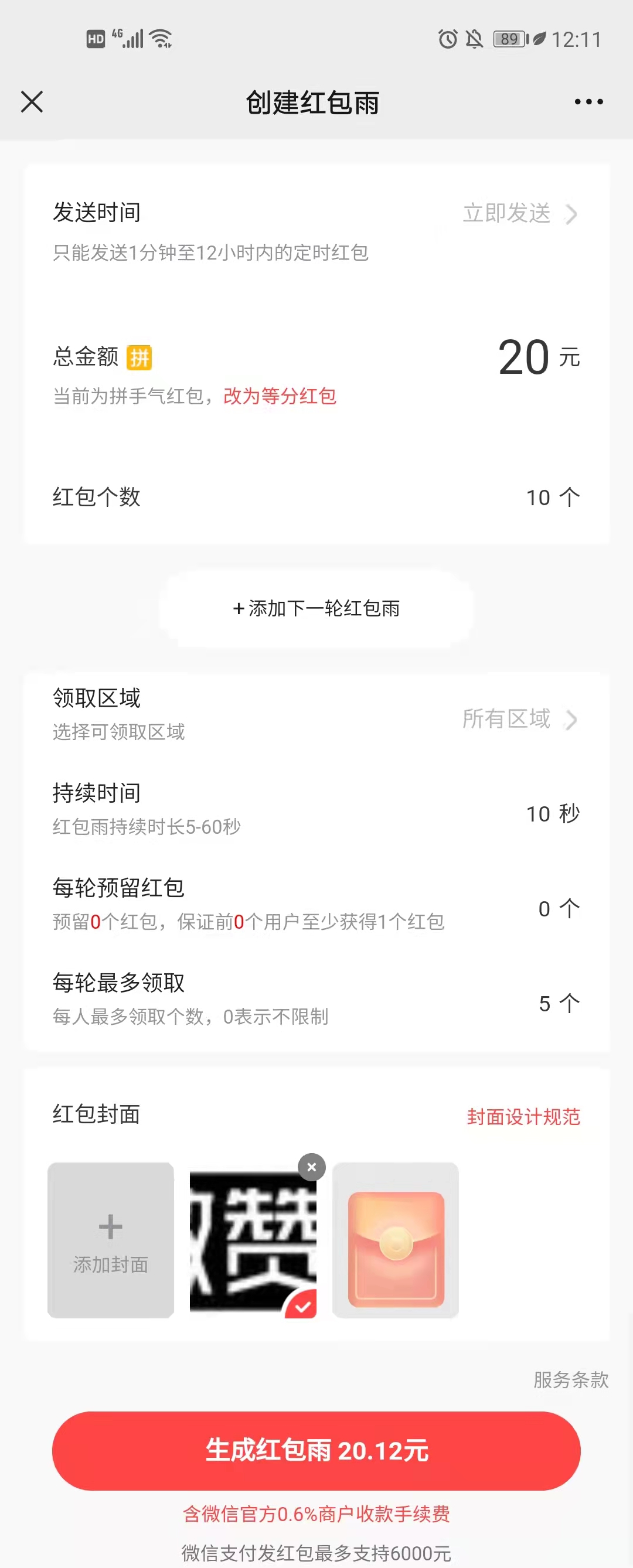 (3)创建红包雨,设置发送时间、红包总金额、红包个数、领取区域、红包封面等信息。