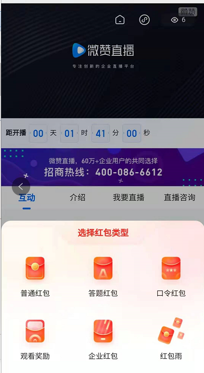 红包雨是微赞直播推出的特色红包功能,管理员发布红包雨后,在设定的时间内,直播间将持续下红包雨,用户点击红包图片即可随机获取红包。支持自定义红包雨封面图案,可上传企业LOGO或自定义图片,红包雨飘动时将会显示自定义图案。